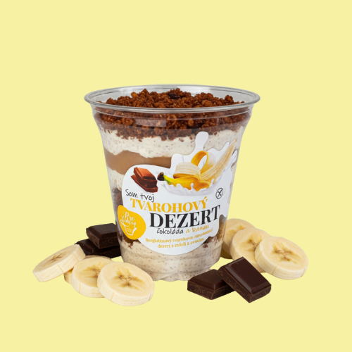 Ručne vyrobený tvarohový krém s intenzívnou horkou čokoládou, 100 % banánovým pyré a chrumkavou čokoládovou granolou.